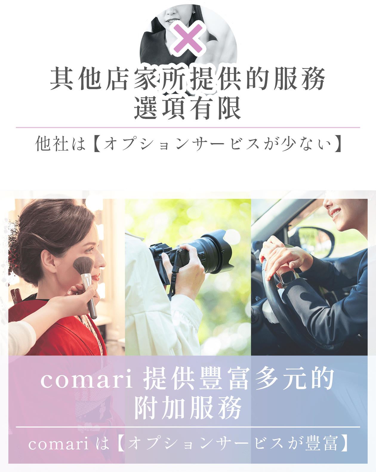 妝髮設計與攝影技巧 プロによる着付け・ヘアメイク・撮影技術我們擁有與大型酒店及婚禮場地合作的豐富經驗,能為您在每一個特別時刻呈現最完美的風采。 大手ホテル・結婚式場と提携する着付け・ヘアメイク・撮影の高い技術力によって、お客様が煌めく最高の瞬間を演出させていただきます。