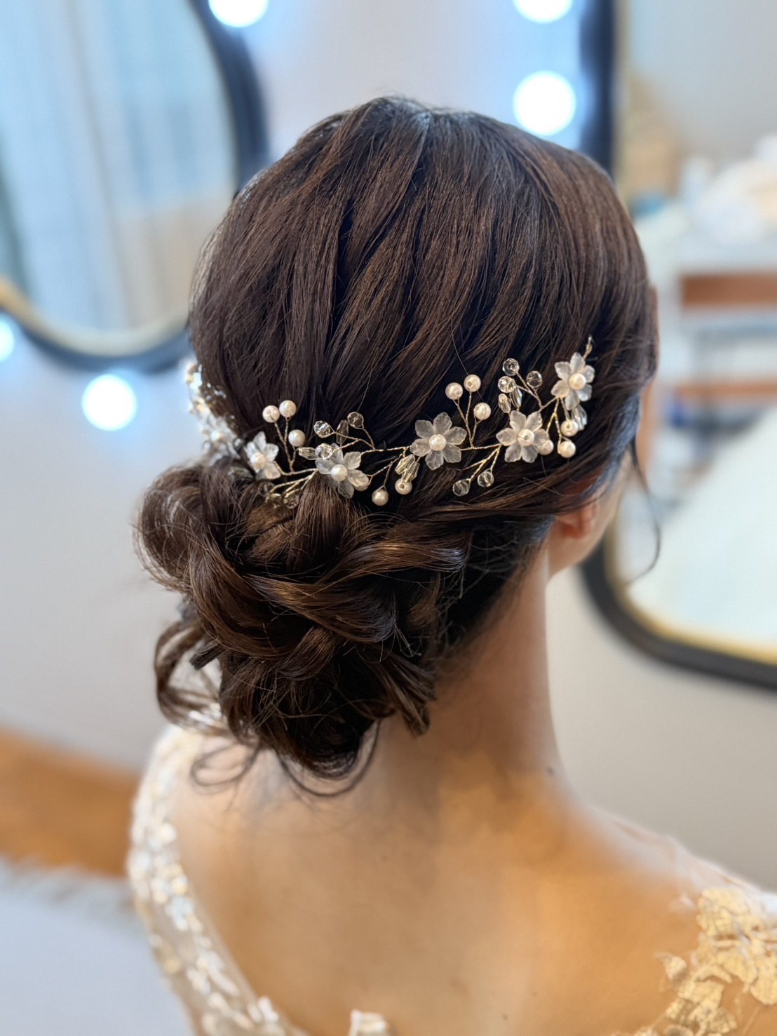 トップもお団子部分もふわふわの華やかなシニヨンにしました。