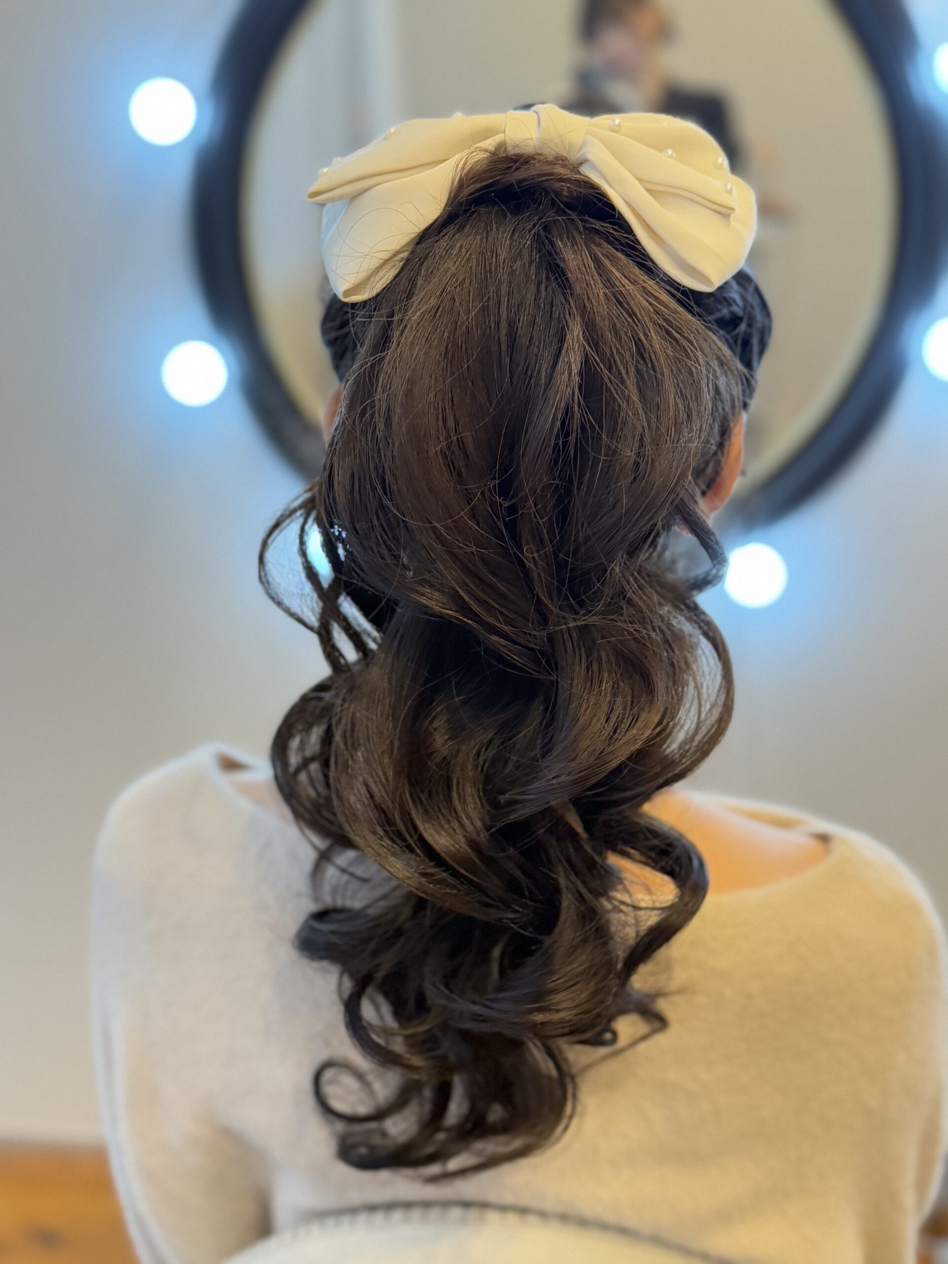 ふわふわのポニーテールですが、巻きに艶が出るよう上品な仕上がりにしました。