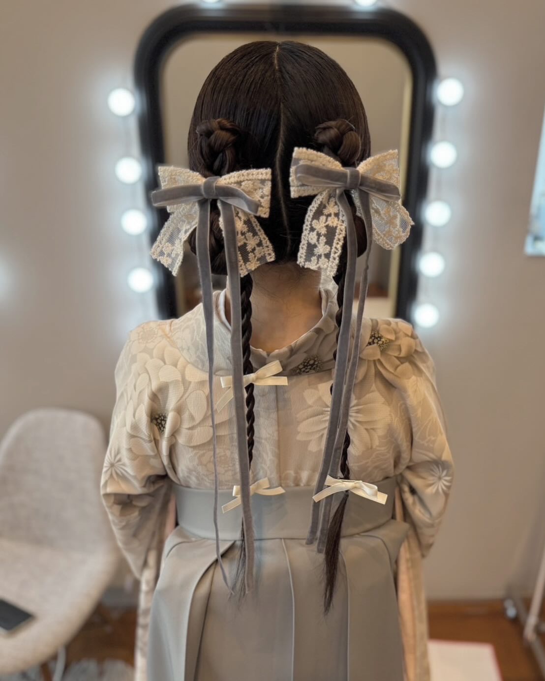お着物に合わせて、グレーのリボンをつけたりと全体のバランスがとてもよく最高に可愛いです。