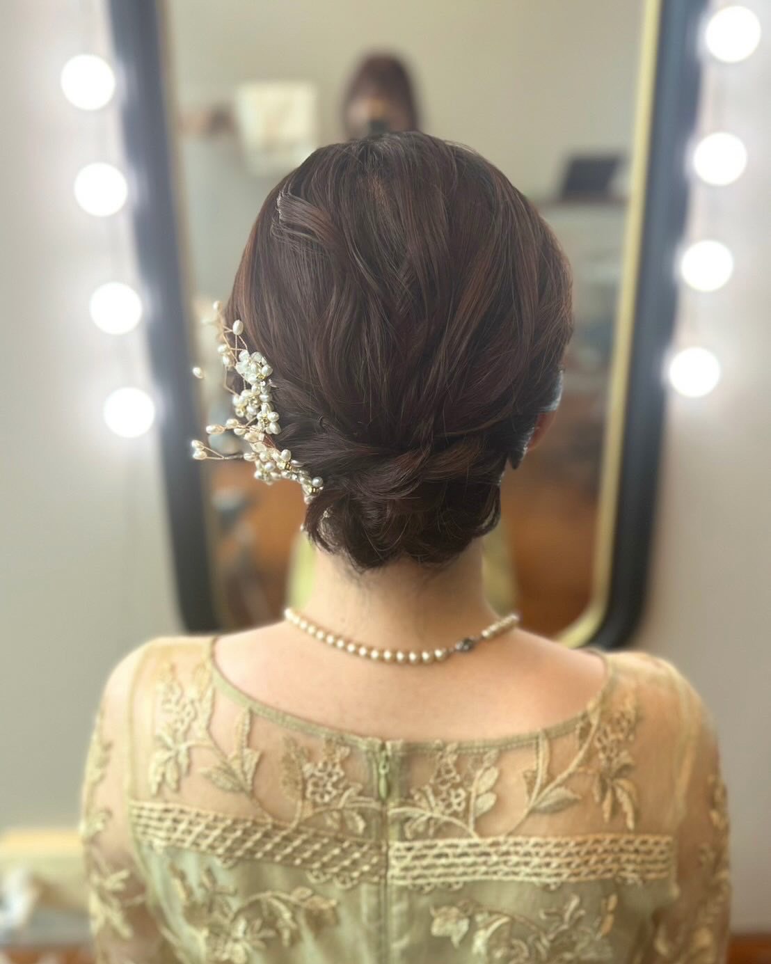 ふわふわのシニヨンです。一見普通のシニヨンに見えますが、髪の長さが短めなお客様です。